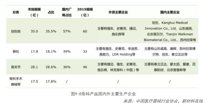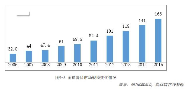 目前,全球生物醫用材料以骨科和心血管兩類(lèi)應用產(chǎn)品的需求最大,分別占全球生物材料市場(chǎng)的37.5%和36.1%;其次以傷口護理和整形外科為主,約占全球生物材料市場(chǎng)的9.6%和8.4%。按照應用范圍,骨科植入物可分為人工關(guān)節、脊柱系列產(chǎn)品和創(chuàng )傷系列產(chǎn)品。