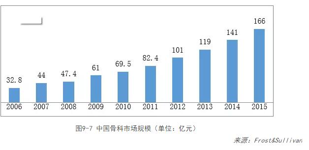 根據Frost&Sullivan的統計,2012年中國骨科器械市場(chǎng)規模約為101億元,同期美國市場(chǎng)規模為89億美元,中國市場(chǎng)規模僅為美國骨科市場(chǎng)規模的1/10,增長(cháng)空間廣闊。預計2012-2015年復合增長(cháng)率為18%,2015年將達到166億元,將超過(guò)日本成為第二大骨科市場(chǎng)。