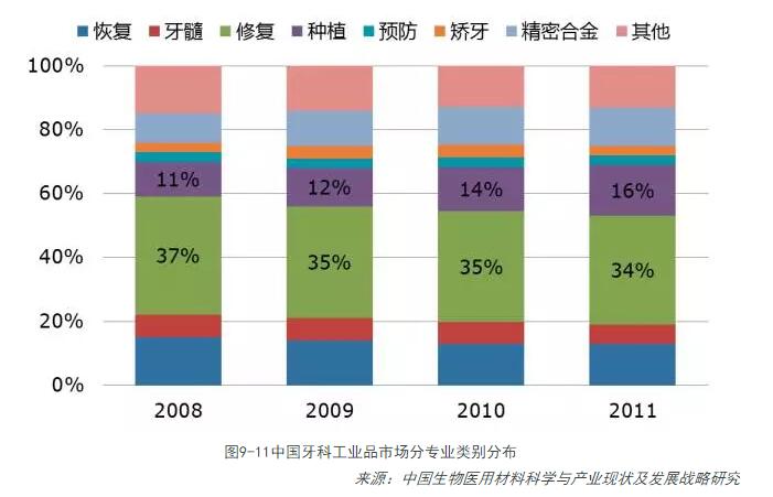 根據DENSPLY公司的估計,全球齒科產(chǎn)品市場(chǎng)約為180億美元,其中材料大概占60%份額。2012年中國假牙產(chǎn)量為8650萬(wàn)顆,占全球60%,預計到2030年,中國牙科材料市場(chǎng)將達120億人民幣。