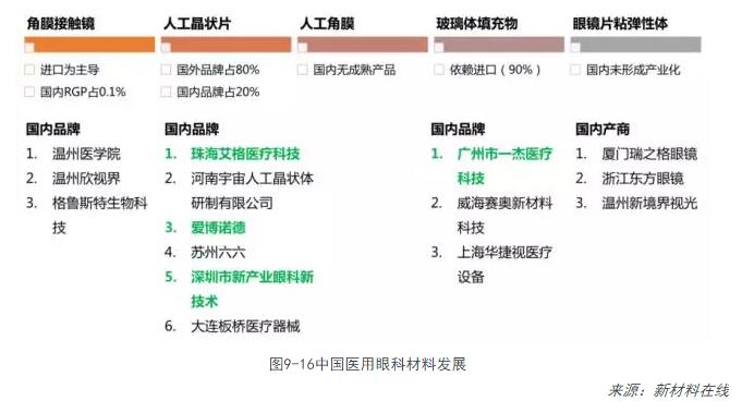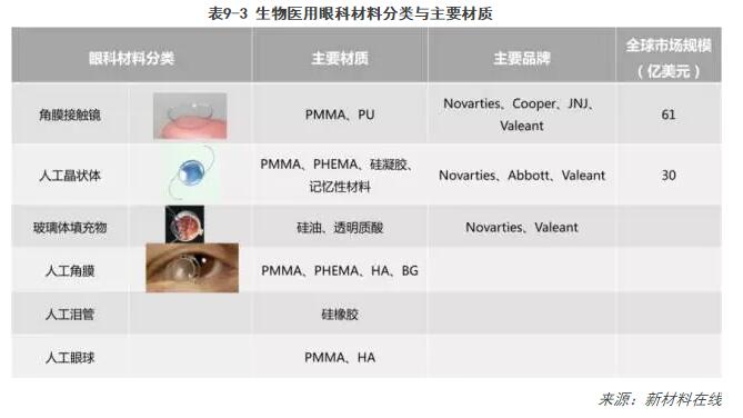 最近三十年中,隨著(zhù)各類(lèi)新型生物醫用材料和新型醫療激光設備等的開(kāi)發(fā)和應用,眼科醫療器械市場(chǎng)得到了飛速發(fā)展。目前,生物醫用材料在眼科疾病治療方面的應用涵蓋角膜接觸鏡(俗稱(chēng)隱形眼鏡),人工晶狀體,人工角膜,治療青光眼植入材料,眼科手術(shù)用玻璃體填充物、粘彈性體,人工眼球,人工眶骨等。目前市場(chǎng)規模最大的是用于近視和散光治療的角膜接觸鏡,其次是用于白內障治療的人工晶狀體。
